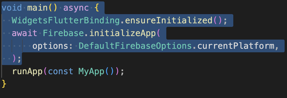 그 다음 main 메서드를 async로 바꾸고 Firebase를 initialize하는 코드를 복붙한다. 이 상태로 바로 실행을 하면 오류가 발생한다.