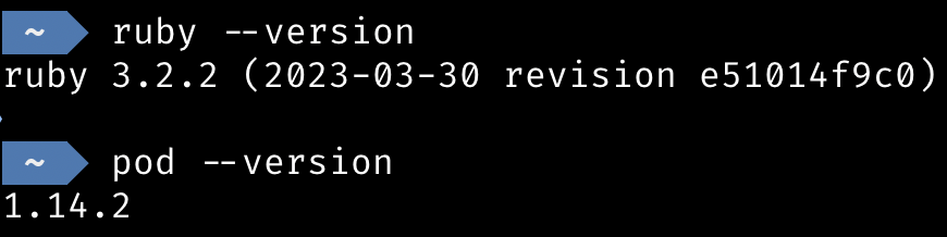 경로로 rbenv 아래에 최신 루비(3.2.2) 아래에 최신 코코아팟(1.14.2)가 깔린 것을 알 수 있습니다!