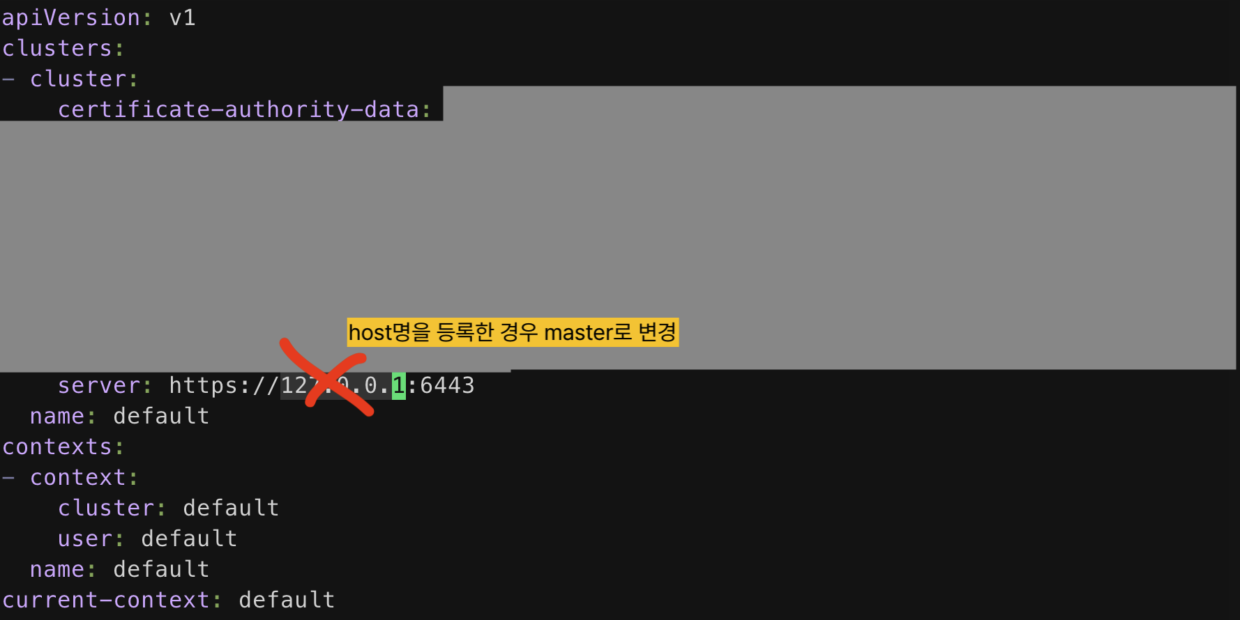 k3s.yaml을 열고 clusters.cluster.server 부분의 값을 수정한다. 127.0.0.1을 master 인스턴스의 것으로 바꿔주자.