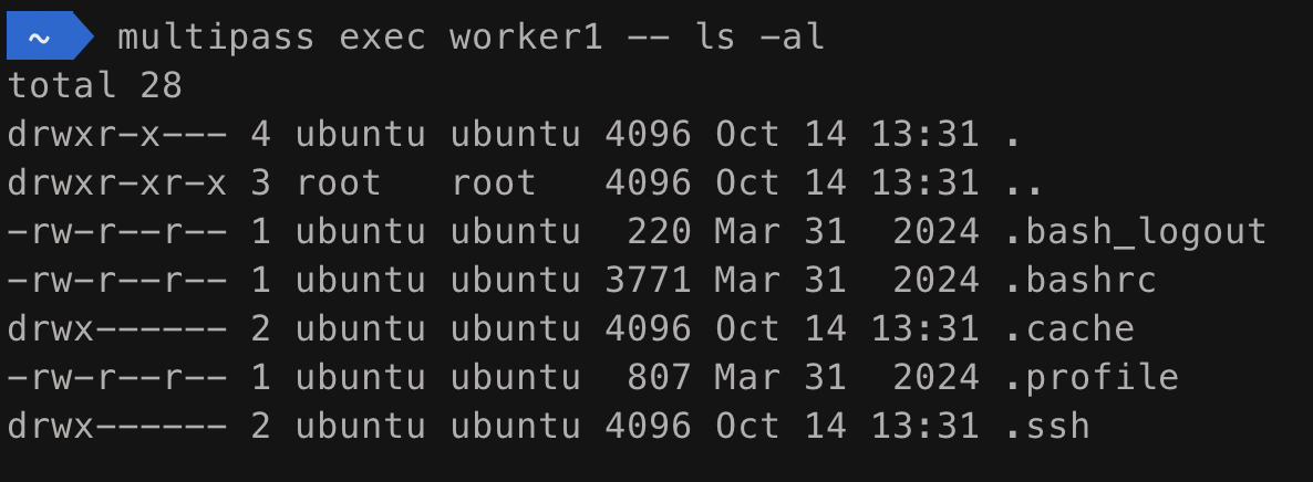 2) multipass exec <인스턴스명> -- <명령어>로 ssh 하지 않고 인스턴스에 바로 명령어를 실행할 수 있다.