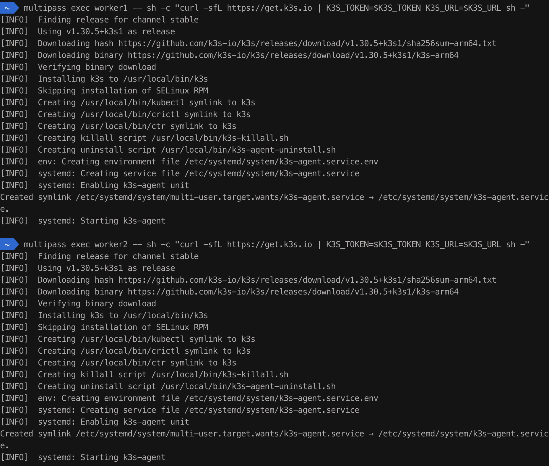 multipass exec worker2 -- sh -c "curl -sfL https://get.k3s.io | K3S_TOKEN=$K3S_TOKEN K3S_URL=$K3S_URL sh -"