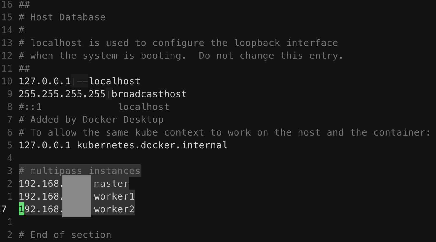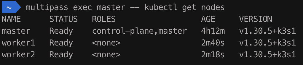 아까 참고에서 설명했듯이 호스트 머신에서 바로 각 인스턴스에 multipass exec로 원하는 명령어를 실행시킬 수도 있다. 이걸 사용해서 나머지 노드의 설치를 진행해 보겠다.