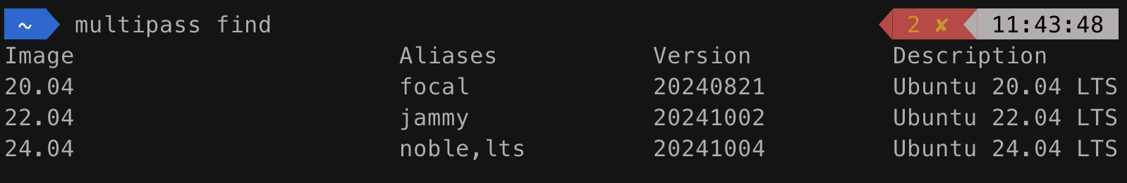 어떤 이미지를 지원하는지 보려면 mulipass find를 실행해 보면 된다.