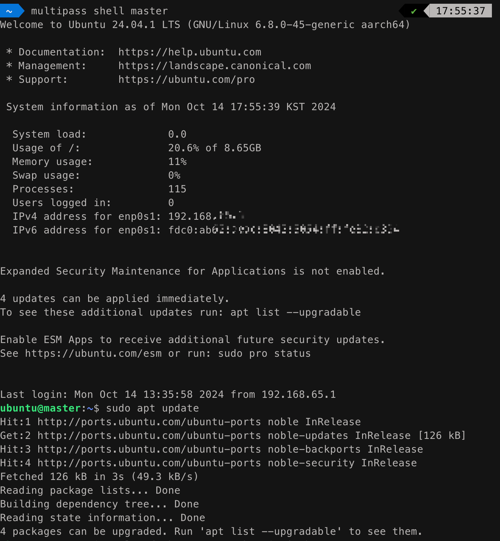 multipass exec master로 master instance로 ssh 했다.