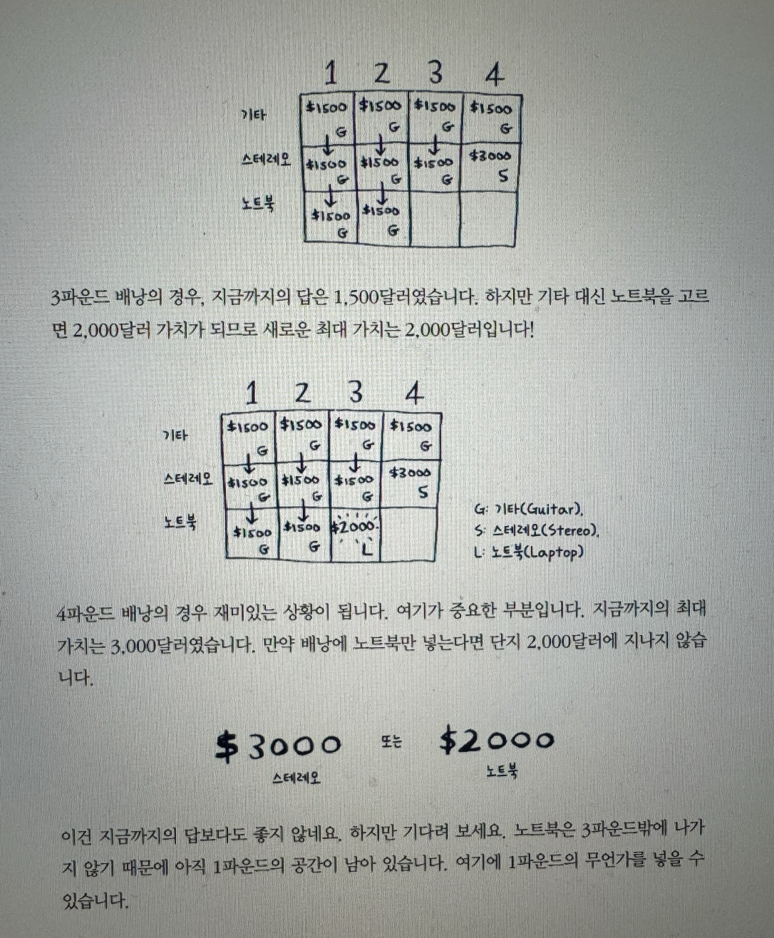 알고리즘을 공부할 때, 교수님께 그림을 그리면서 전개과정을 보면 좋다는 조언을 받고 이후 제시된 알고리즘이 이해가 안 되면 항상 그림을 그리면서 이해했습니다. 지금도 헷갈리면 이렇게 하고 정말 좋은 방법이라고 생각합니다. 이 책이 그런 과정을 미리 준비해 놓은 것 같은 느낌입니다. 예로 동적 프로그래밍(DP)의 대표적인 문제인 Knapsack 문제의 표와 그림을 캡처해왔습니다. 이런 과정을 책을 덮고 스스로 할 수 있도록 연습을 한다면 이 책을 200% 활용할 수 있지 않을까 싶습니다.