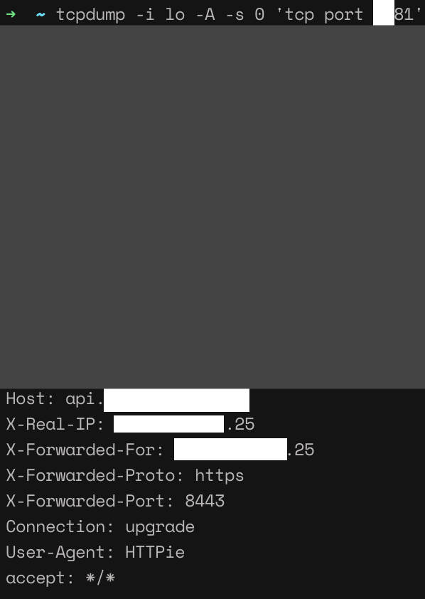 nginx가 필요한 header를 붙이고 전달한 패킷은 HTTP이기 때문에 tcpdump로 간단하게 확인해볼 수 있겠다 싶어서 tcpdump를 해서 내용을 살펴봤습니다.