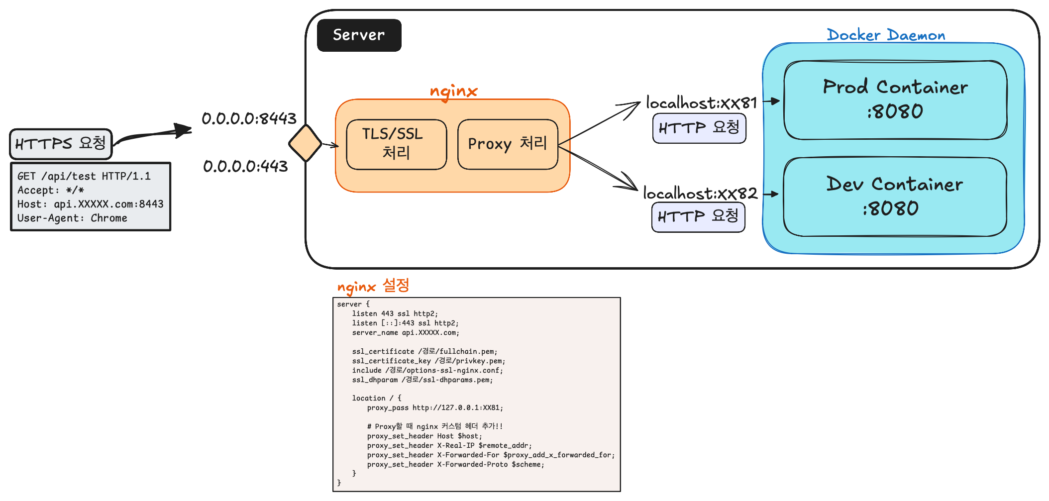 443(프로덕션용)이나 8443(개발용)으로 온 HTTPS 요청은 먼저 Nginx에서 처리합니다. Nginx가 TLS 처리를 하고 http 패킷 형태로 header를 추가해서 컨테이너로 전달합니다.