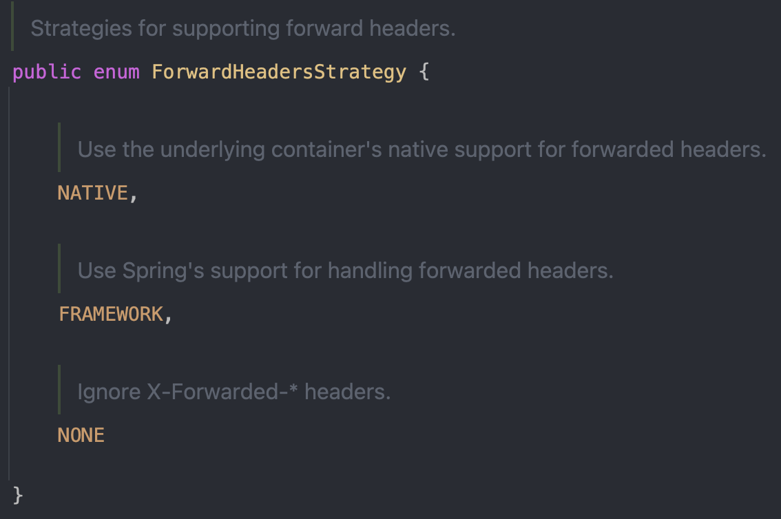 말고도 다른 글도 찾아 보면서 ForwardHeadersStrategy 설정을 통해 가능하다는 것을 알았습니다. 이때 X-Forwarded-* header를 처리하는 방식으로 native와 framework 두 가지 Strategy가 지원된다는 것을 알았습니다.