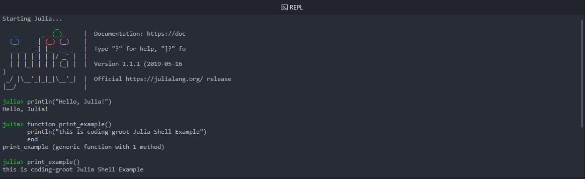 - Julia Shell or REPL(Read Evaluate Print Loop)