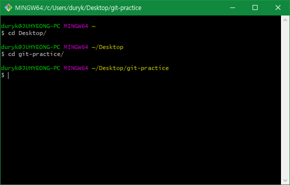 cd 명령어로 Working Directory를 git-practice로 설정해줍니다. (cd 명령어는 Change Directory의 약자입니다.)