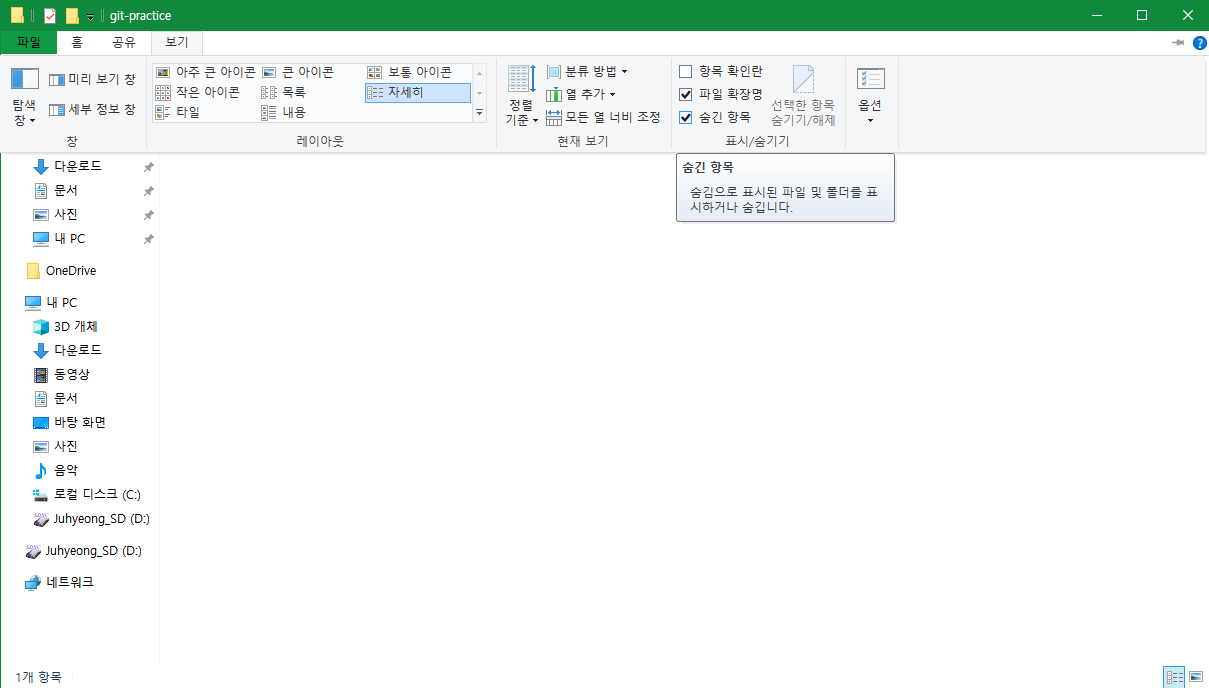 - 보기 > 숨긴 항목을 체크하면 숨겨진 파일을 볼 수 있게 됩니다.