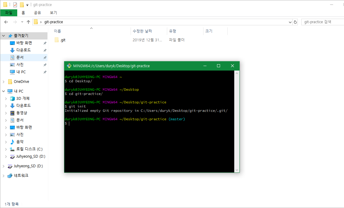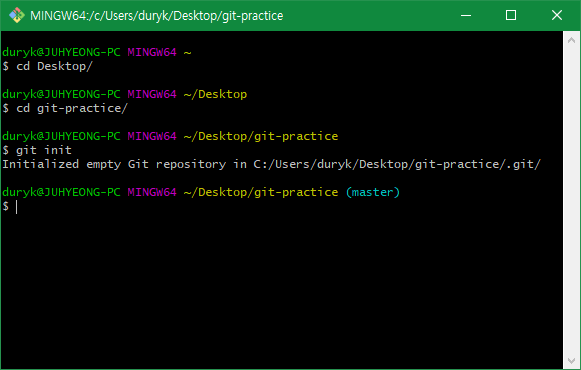 git-practice 폴더를 Git 저장소로 만들어 주려면 git-practice라는 폴더로 (git-bash의) cd 후 git init이라는 명령어를 사용해야 됩니다.