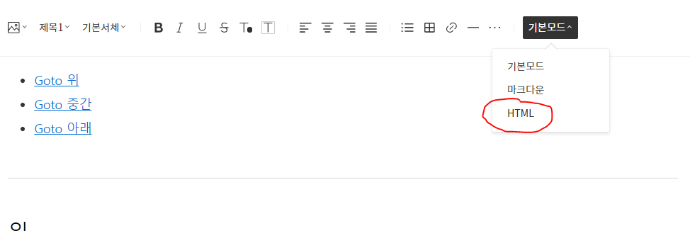 우리가 태그에 id를 부여하고 Anchor 태그를 달아주려면 티스토리의 HTML 편집 에디터에 들어가야 한다.