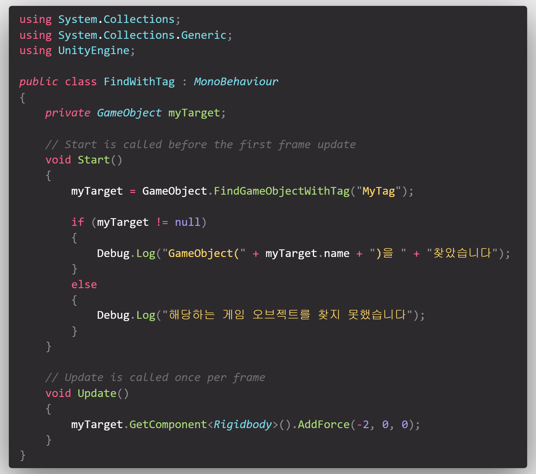 태그를 달았으면 게임 오브젝트의 이름이 아닌 태그로도 찾을 수 있게 됩니다. 한번 태그로 게임 오브젝트에 접근해보겠습니다.