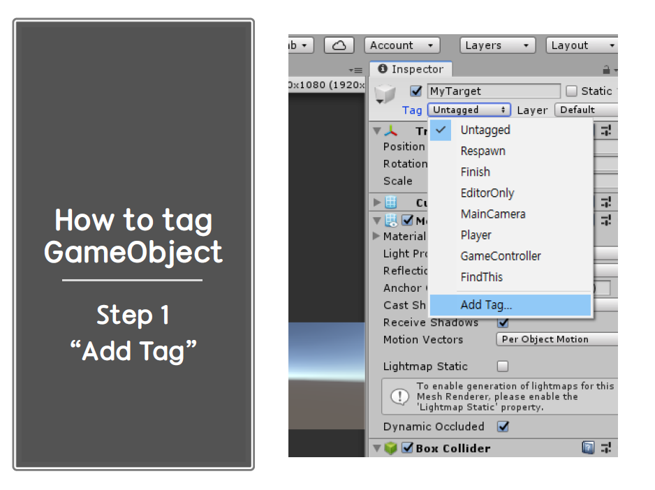 Step 1. 인스펙터 창의 Add Tag... 클릭Step 2. "원하는 태그명"을 저장한다.Step 3. 태그를 달고자하는 게임 오브젝트를 클릭 후 인스펙터 창의 내가 방금 Save한 태그를 클릭