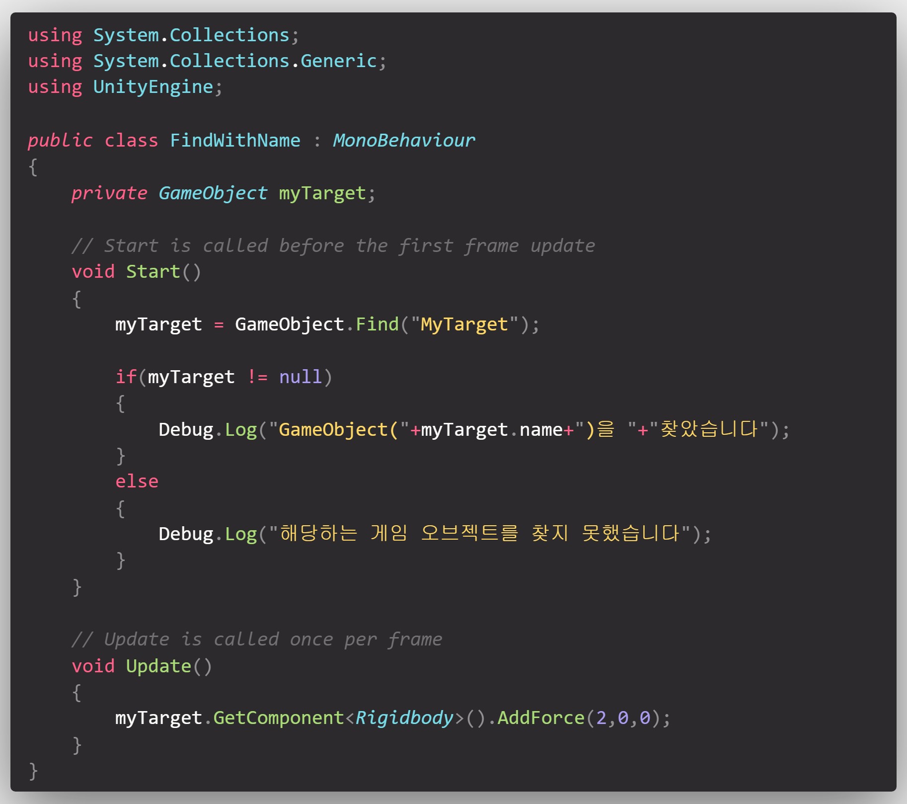 Find함수를 사용해서 이름으로 게임 오브젝트를 찾아서 접근할 수 있습니다.MyTarget이라는 이름의 게임 오브젝트를 찾아서 힘을 가하는 코드