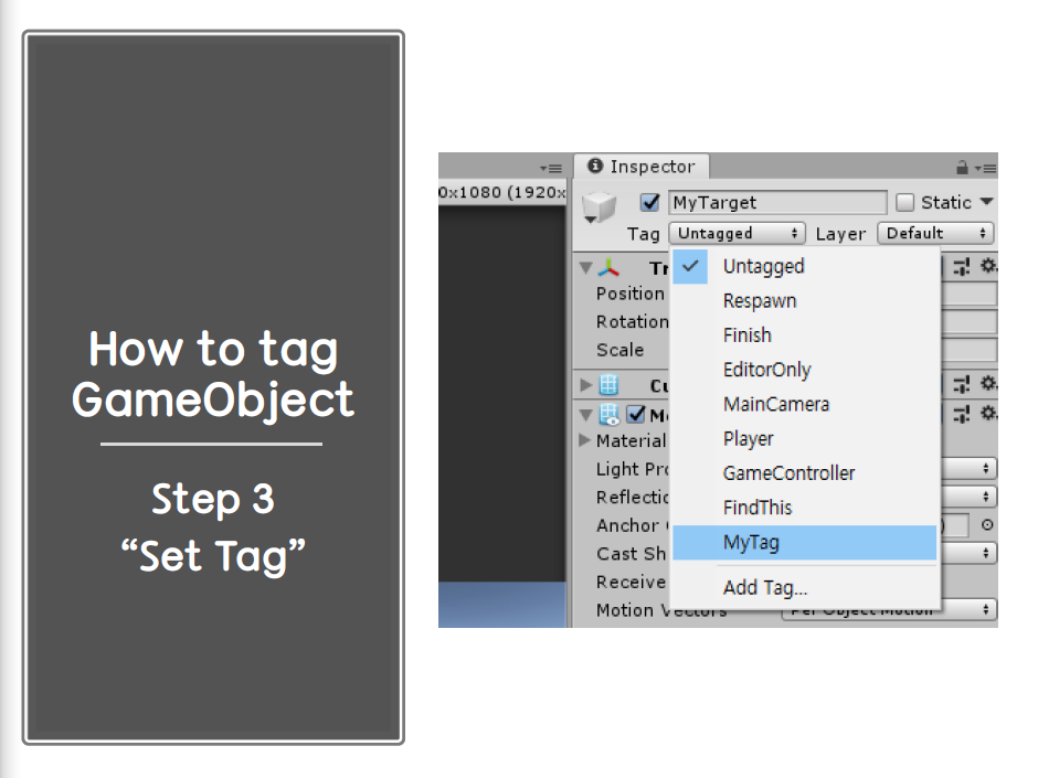 Step 1. 인스펙터 창의 Add Tag... 클릭Step 2. "원하는 태그명"을 저장한다.Step 3. 태그를 달고자하는 게임 오브젝트를 클릭 후 인스펙터 창의 내가 방금 Save한 태그를 클릭