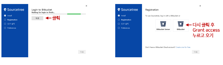 Bitbucket에 로그인하라는 인터넷 창이 열릴겁니다. 이 창이 자동으로 열리지 않으면 설치 프로그램 끄고 다시 시도해보세요.