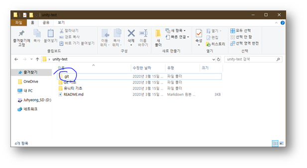 .git 폴더는 숨김 폴더이기 때문에 허용을 해줘야지 보인다. (탐색기의 상단에 보기 탭 > 숨긴 항목 체크)