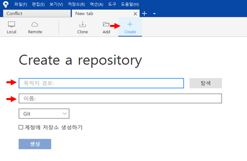 두 가지 설정을 해준 뒤 생성 버튼을 클릭하면 저장소로 선언이 된다.
