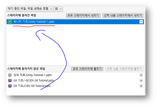 우리가 자주 사용할 창이다. 우리는 프로그래밍을 하거나 다른 여러 가지 작업을 하면서 이 저장소에 파일을 넣고 빼고 수정을 가한다. 그때마다 우리의 파일들이 어떤 상태인지 확인할 때 사용하는 창이다. 이 창에서 우리는 변경한 파일을 선택해서 기록(commit)할 수 있다.