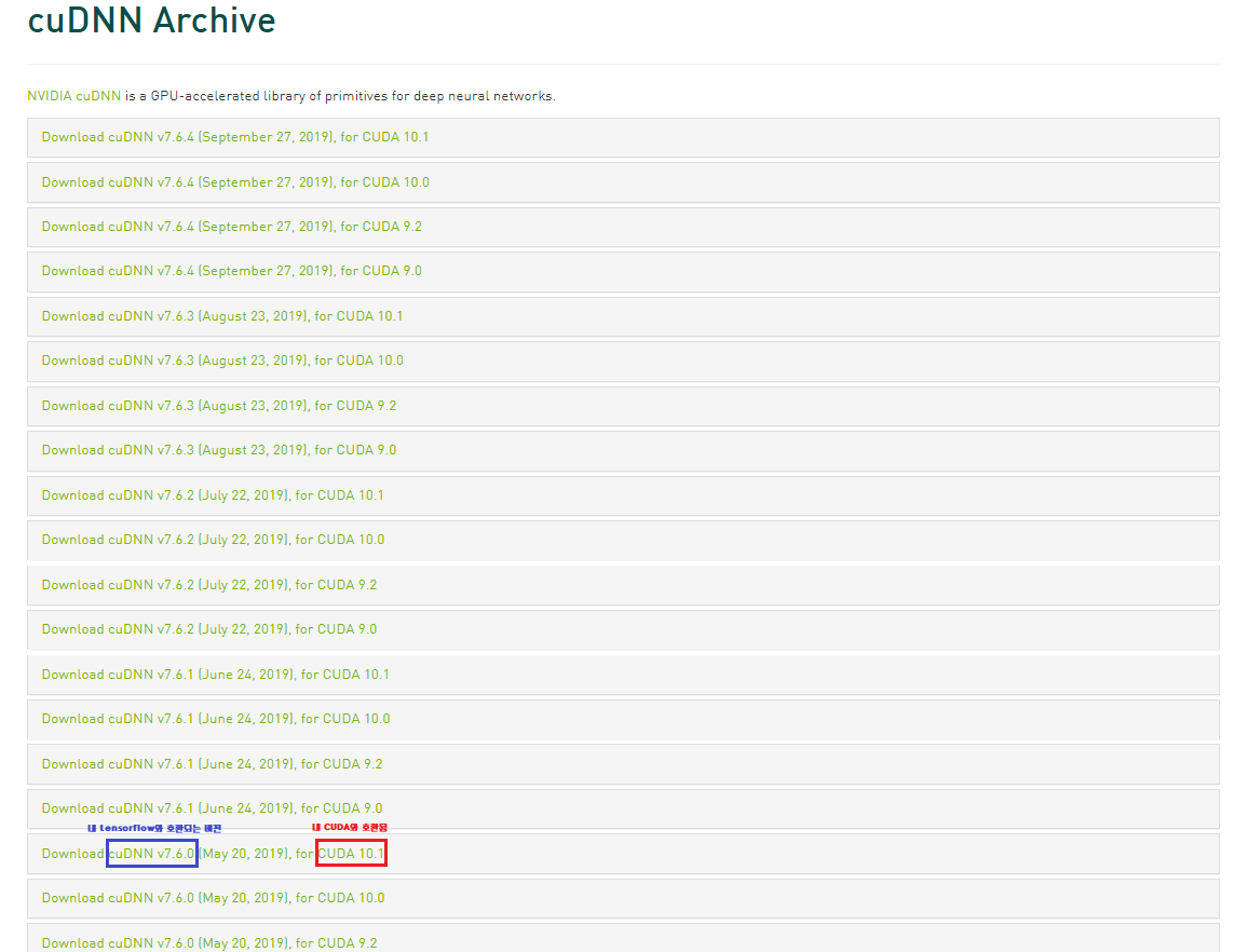 NVIDIA cuDNN Archive 링크: https://developer.nvidia.com/rdp/cudnn-archive