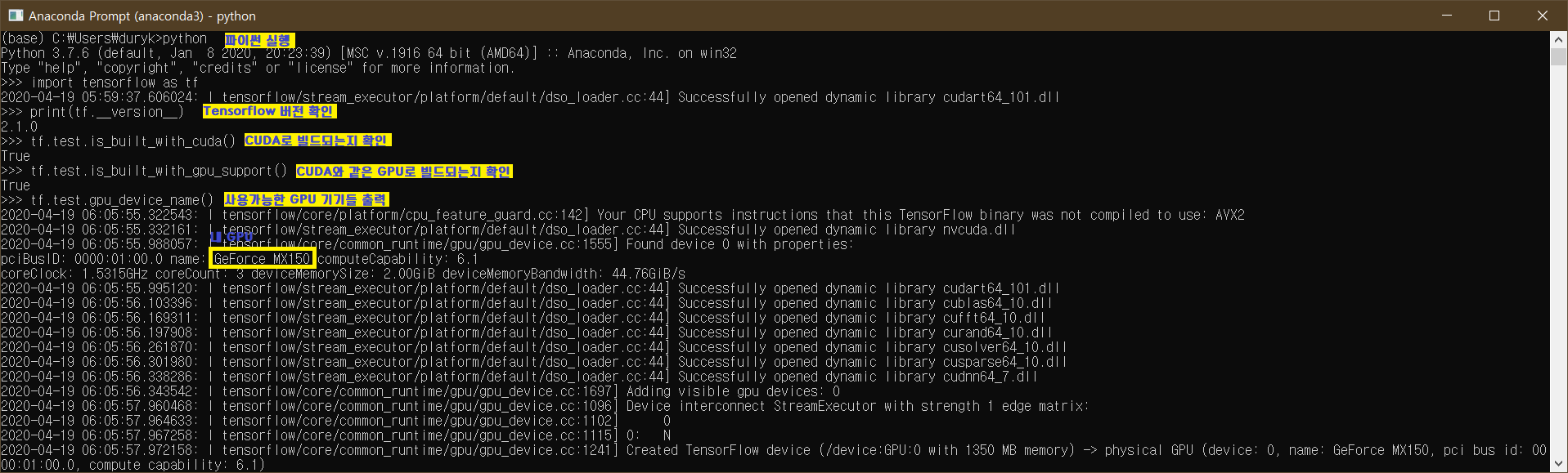 먼저 Anaconda Prompt에서 python이라고 쳐서 파이썬을 실행한다. 그리고 tensorflow의 test 모듈로 잘작동하는지 확인해본다. (ex)test.is_built_with_cuda() 함수로 CUDA GPU가 작동하는지 확인할 수 있다.
