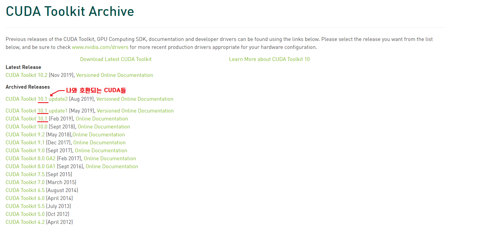 NVIDA CUDA Toolkit Archive 링크: https://developer.nvidia.com/cuda-toolkit-archive