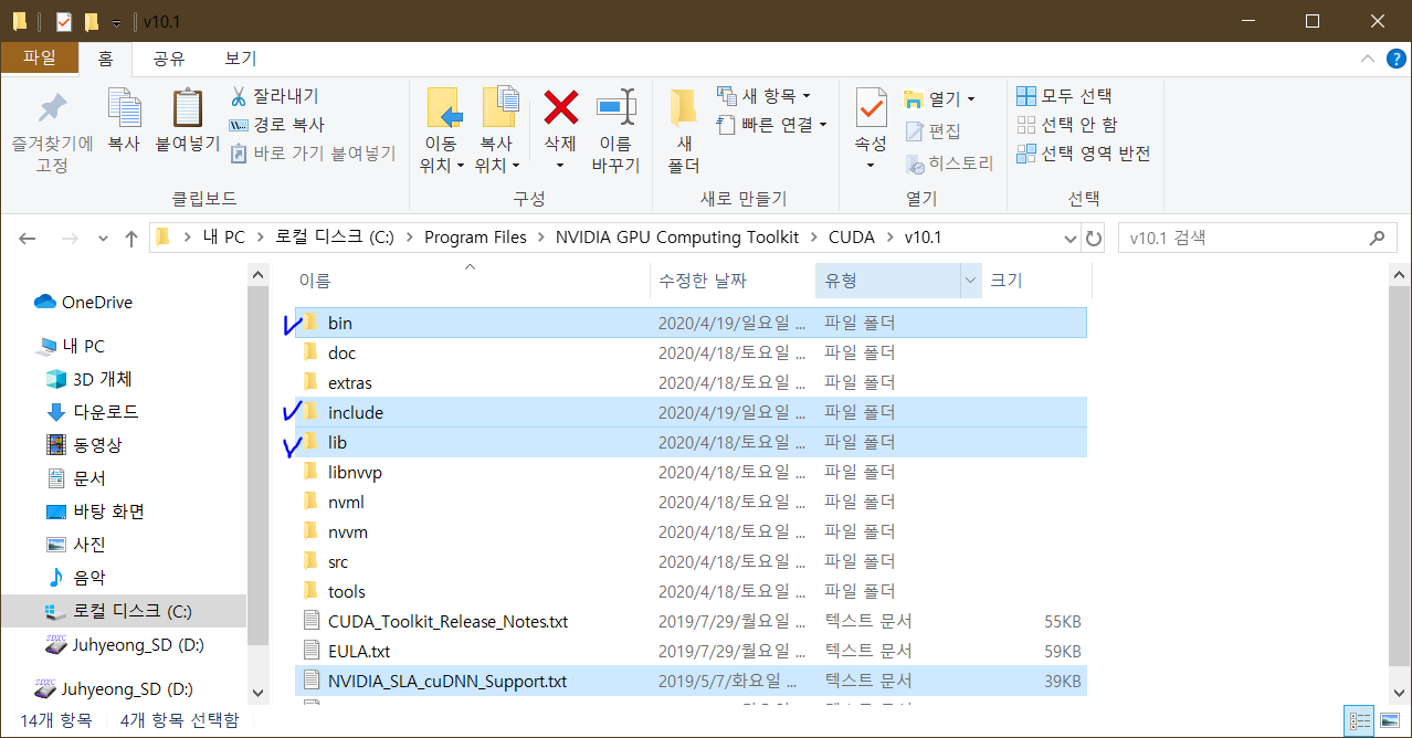그리고 압축을 푼 cuDNN 파일들을 C:\Program Files\NVIDIA GPU Computing Toolkit\CUDA\v10.1로 옮겨서 bin, include, lib 폴더를 덮어씌웠다.