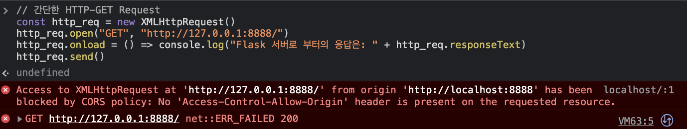 먼저 CORS 설정을 해주지 않은 Flask Server에게 다른 Origin에서 요청을 보낸 후, 그 응답을 읽어보려고 하면 어떻게 되는지 보여주겠다.