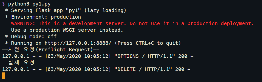 * 참고로 Flask는 OPTIONS 메서드를 자체적으로 처리한다는 것 같다...? 그렇기 때문에 위 코드의 if http_method == "OPTIONS": if문이 실행되지 않을 수도 있다. 코드는 참고만 하자.