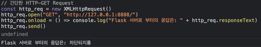 간단한 Javascript 코드로 다른 Origin에서 Flask 서버의 응답을 받아서 읽어 오려고 시도한다.